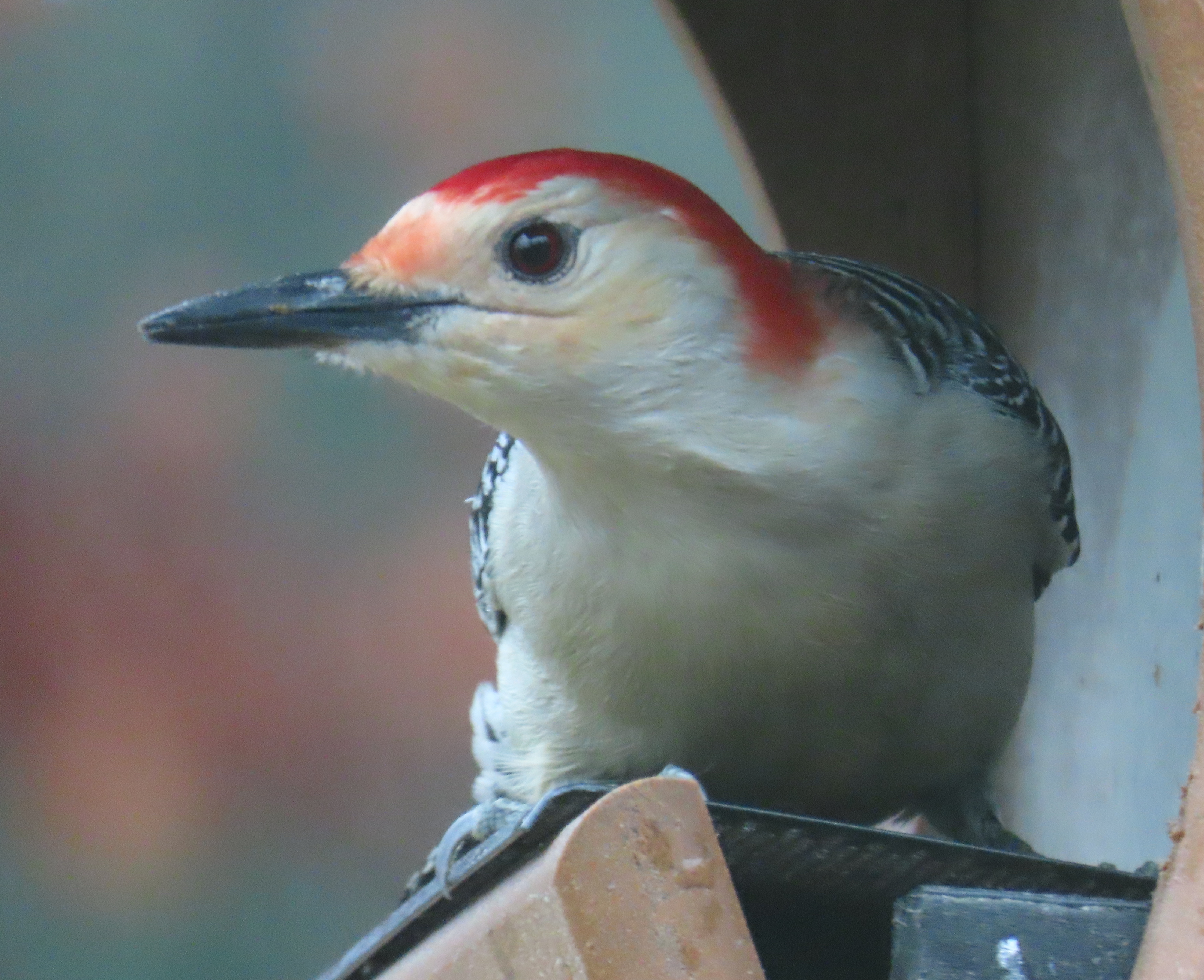 Red-bellied woodpecker hunkered down on the feeder