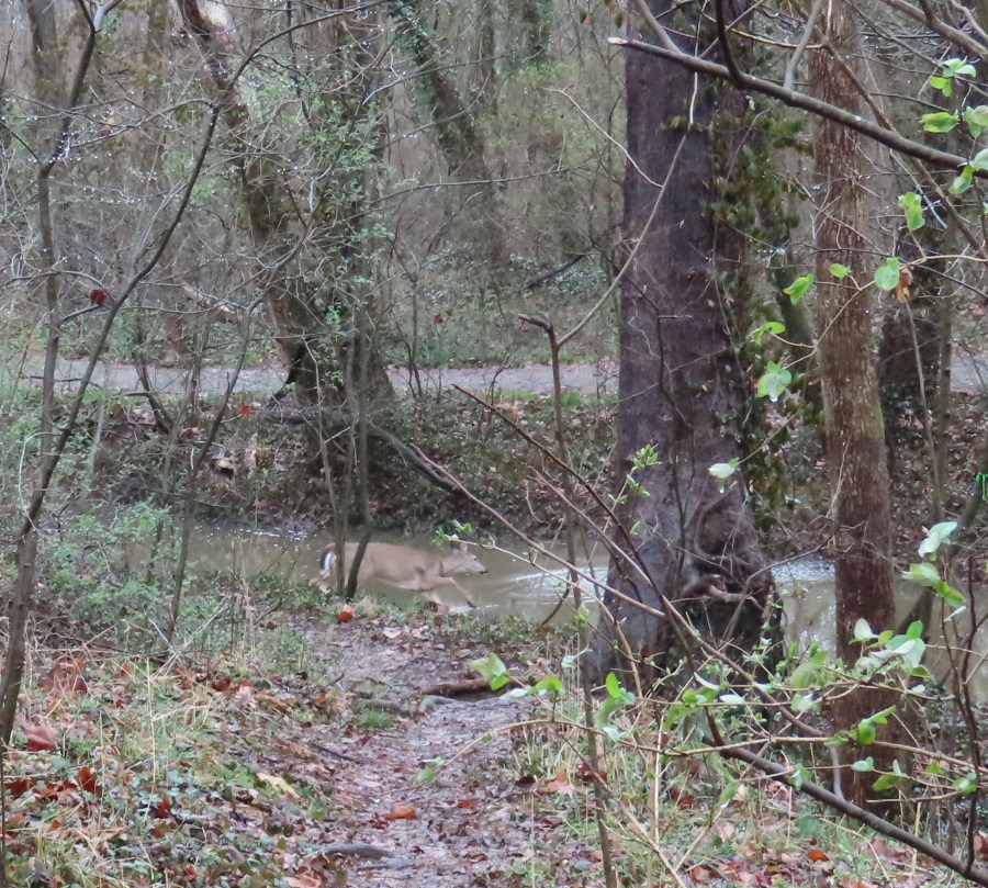 In this picture a deer is jumping into the water. You can see the splash from another deer too.