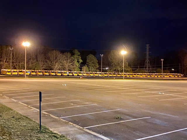Here’s a sight I don’t normally see. When the dogs and I finish up our evening walk, this parking lot is normally empty. But with school closing for two weeks, Henrico County Public Schools is parking a whole row of buses across the street from our house for the duration of the Coronavirus/COVID-19 break: