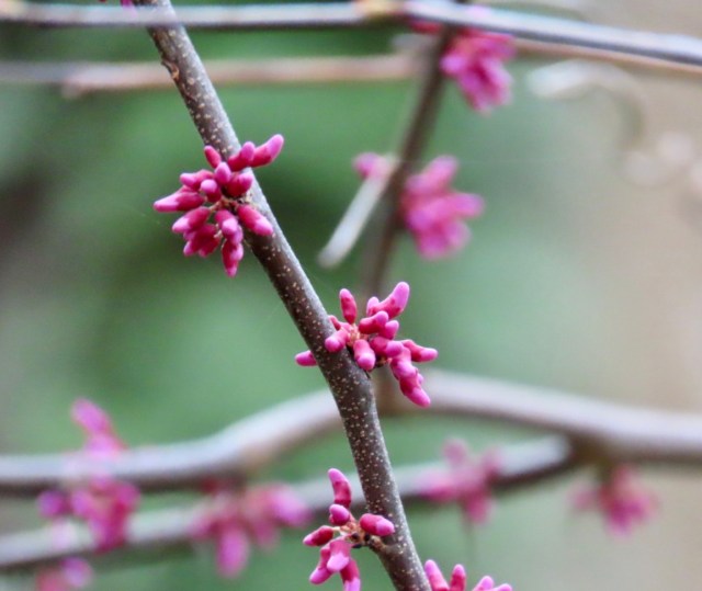 Spring and Fall (Autumn) begin on the two “equinoxes”, or days in the year that have twelve hours of dark and twelve hours of light. In Spring (begins this week) the days have been getting longer and will continue to get longer until the June solstice on June 20. The Spring and Fall equinoxes mark the beginning of each of those seasons. The June solstice and the December solstice mark the beginning of Summer and Winter respectively. So these redbuds (and a few other flowers) are the first to show up each year. The early birds are nesting, and raptors are the most visible. They begin before songbirds.