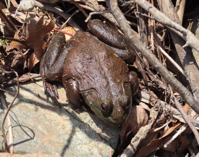 I wish the light had been better for this image, but oh well. I saw an American bullfrog this week! On the Virginia Herpetological Society’s page on bullfrogs it says “Males are generally smaller than females”. I’ve seen a few bullfrogs before and this was really, really big – I’m almost certain she’s a female. Check this out: