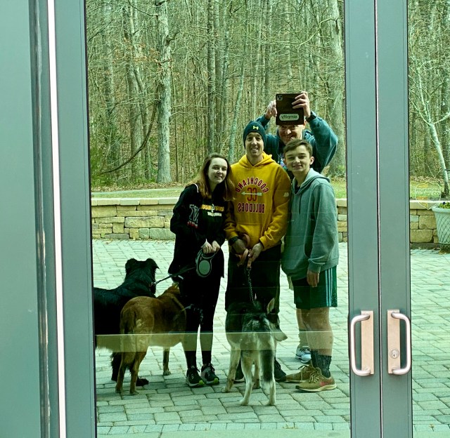I forgot I had people pictures this week – thanks to schedule disruptions from coronavirus/COVID-19. We had a nice four human/three dog hike at Deep Run one day this week. We of course faced the mirror (window); the dogs faced us. Couldn’t be helped: