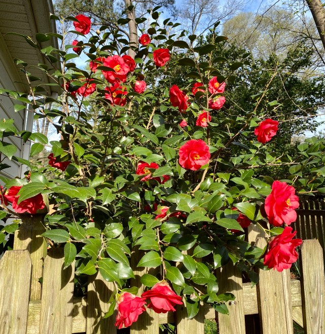 Look at that plant after she took those blooms inside. Early Spring Camellia bush, in the picture dictionary next to “prolific”: