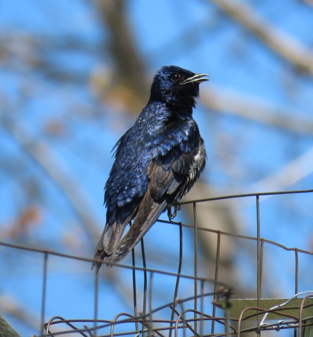 This post is “peace like a river” but it’s not a stretch (IMO) to use the river as a proxy for the natural world. I’m aware the coronavirus is also from the natural world but the twenty-four hour news cycle is not. The river and the owls and the bluebirds and the hawks, even the starlings are more peaceful than anything from any news outlet I’ve noticed. The same is true for the azaleas and the daffodils and even the dandelions; they have no agenda. Evelyn and the dogs and I took a relaxing hike at Bryan Park yesterday; here’s a Purple Martin we saw: