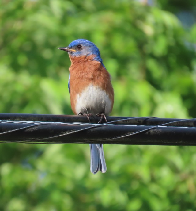 I was fortunate to see a handsome male Bluebird perched on a wire while Mackey and Turner and I were headed out to pick up Yuki for our hike at Pony Pasture. He was very accommodating! I’m always grateful to get a picture like this: