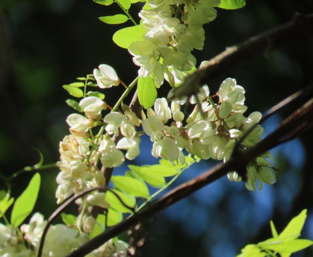 Black locust trees are common in Virginia, but they hide in the background and don’t draw lots of attention. But they’re flowering right now (today) and I did manage to get one picture this morning at Pony Pasture. Unfortunately these were too high off the ground to smell. I have never smelled a tree flower as fragrant as a black locust. I’ve hardly smelled any flower as fragrant as a black locust.