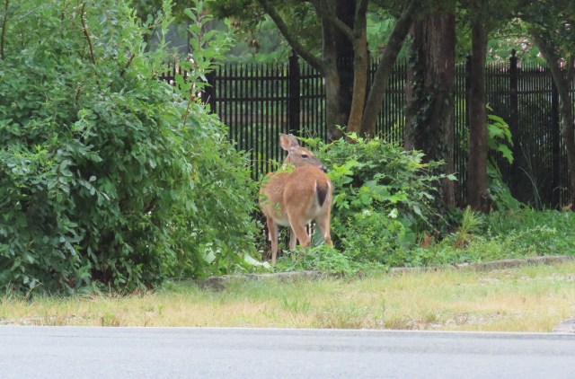 Whitetail deer thoughtfully pruning shrubs near U of R
