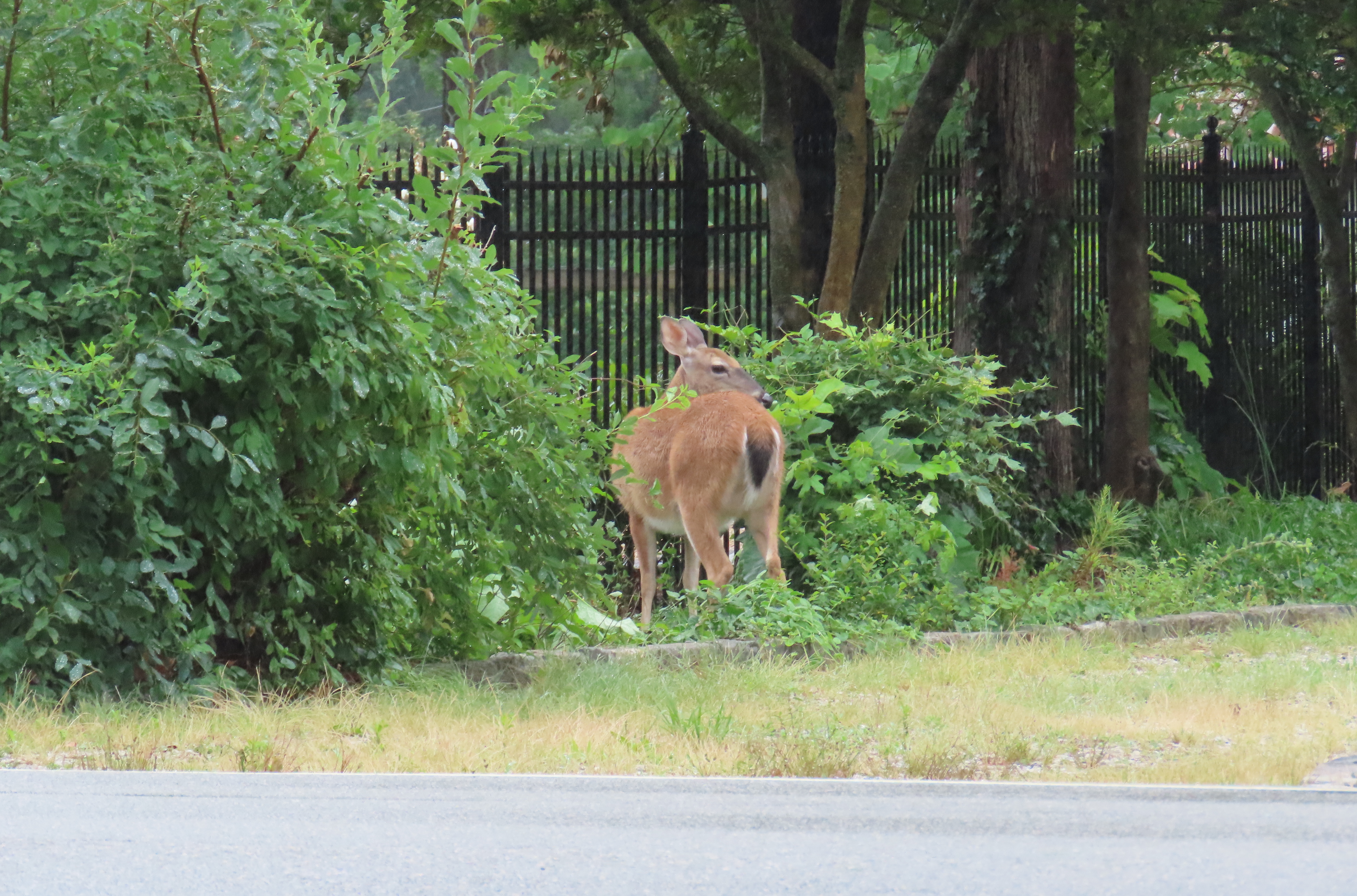 Whitetail deer thoughtfully prunes shrubs near U of R