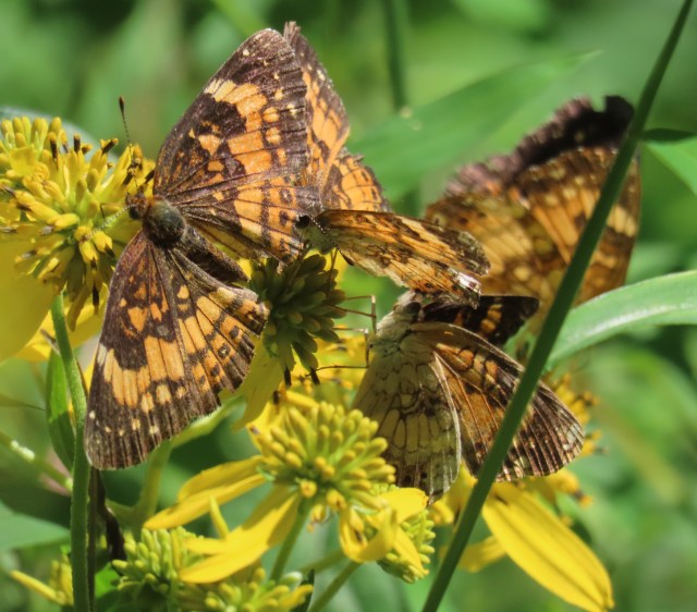 I uploaded that picture to the web; google and another app identify them as a Silvery Checkerspot (Chlosyne nycteis). I don’t 100% trust that; please leave a comment on here if you know different.
