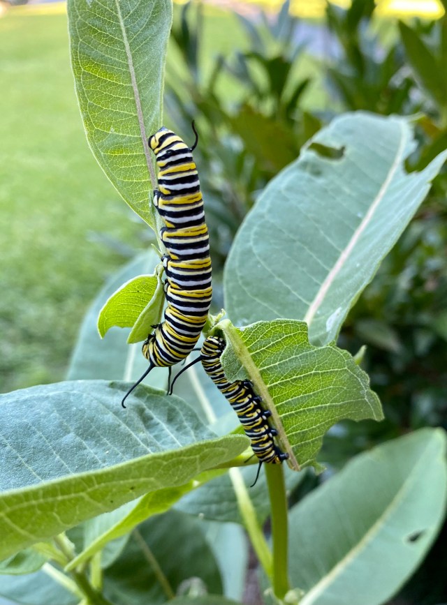 Our milkweed got top heavy and bent over at a 90º angle, parallel to the ground. Twenty four or forty eight hours later it bent (to follow the sun) another 90º to turn vertical again. Monarch butterfly caterpillars think it’s an edible and delicious jungle gym. At around 5:30 this evening I went outdoors to photograph a few. The light was not super helpful; I only got one picture I enjoyed. But I could count at least ten caterpillars, and maybe there were more. It’s a jungle gym after all, not a ladder: