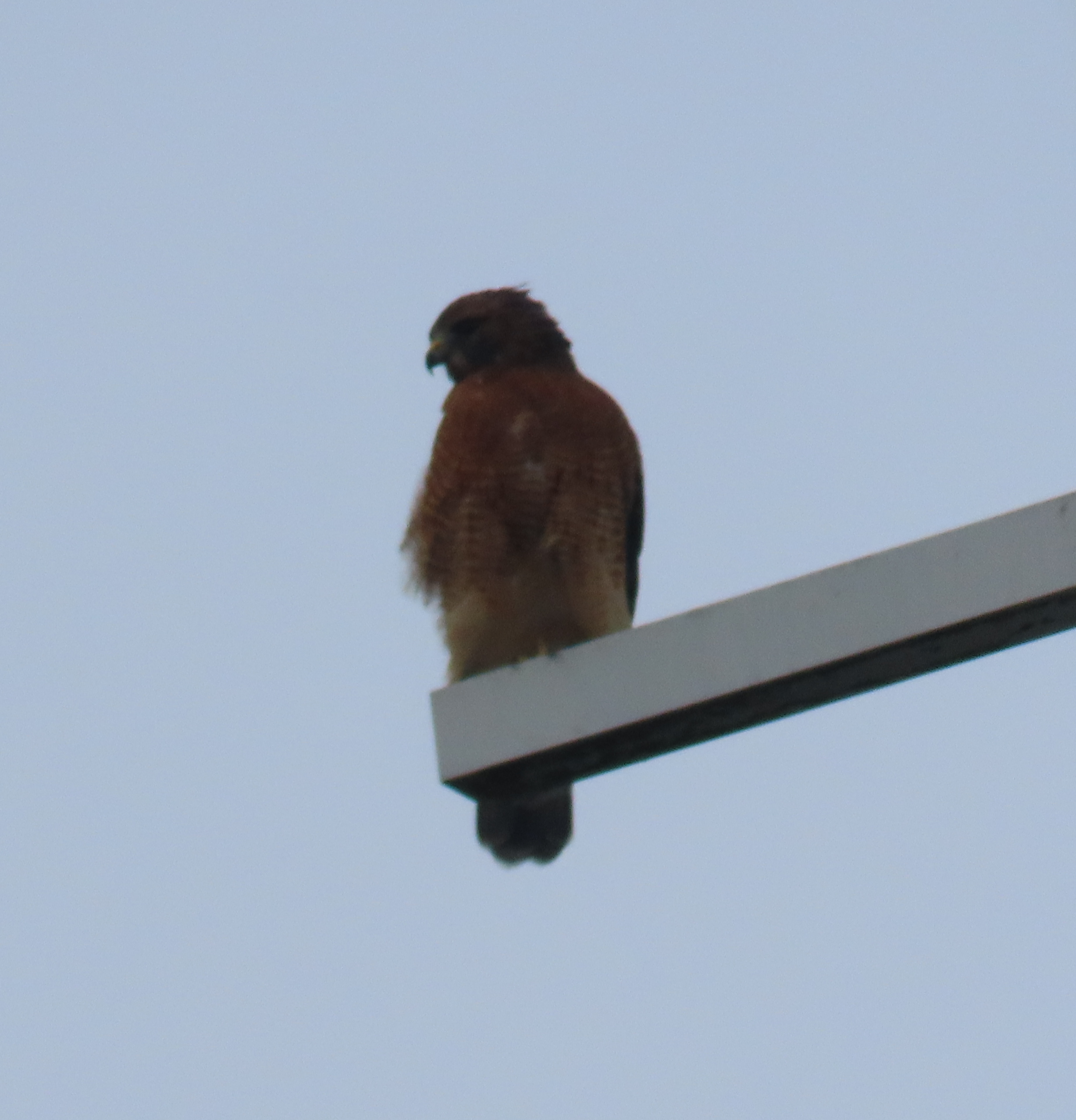 Half a pair of Red-shouldered hawks perched on the cross at Staples Mill Road Baptist Church: