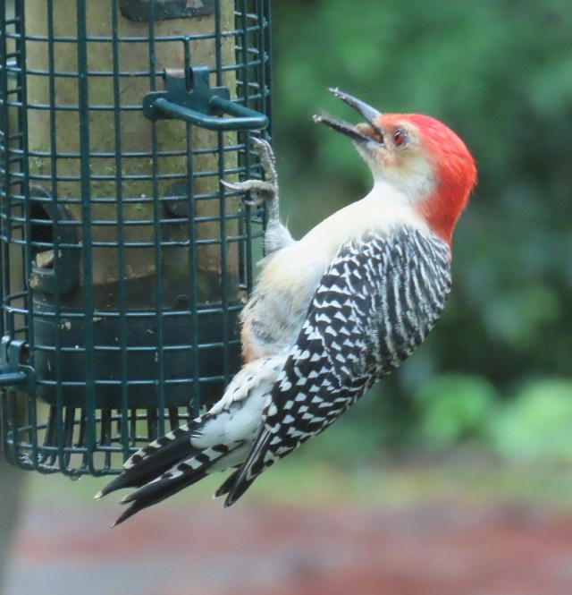 Red-bellied woodpeckers were less of a surprise for me, but they photograph well and I always like to see them on my feeders. I have learned to distinguish genders in woodpeckers since I put my feeders out. This is a male. See how the red color goes all the way to the front of his head? Females have a red streak that extends two thirds of the way up the back of their heads: