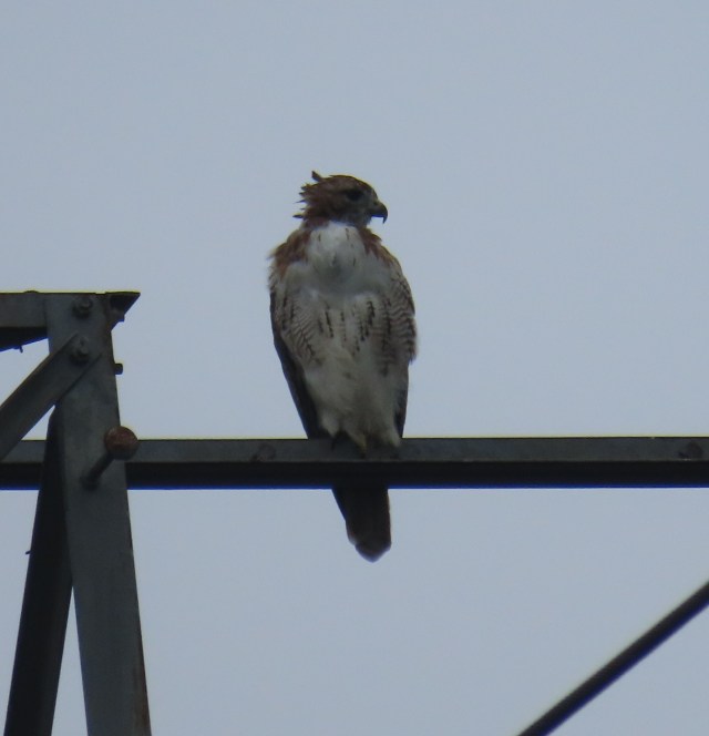 I wish the light had been better and I’d been closer (cameras love more light and being closer to the subject) but I always love seeing Red-tailed hawks. I saw the nuthatch and the woodpecker around 11:00 yesterday morning. I photographed this hawk two blocks from my house at 4:00 PM the same day: