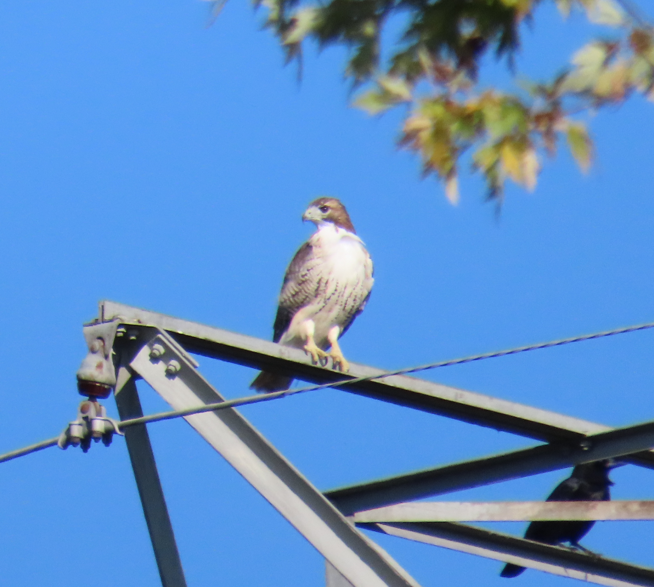 I regret my lack of success with both my camera and my phone this week. Of course I saw a decent number of hawks, but this is the only picture worth posting. Notably (IMO) I photographed another pair of Red-tails together, on Tuesday near the Westbury Apothecary. The light was poor and the distance and angle were unfavorable and although I got pictures for my records, none were blog worthy. I saw this healthy looking female at the corner of Westbury Drive and Bentridge Lane. If you look closely on the lower right you can see a crow; there were three up there. They were harassing her, but not with any vigor. I’m sure noone has any offspring around; I had the sense they were just going through the motions: