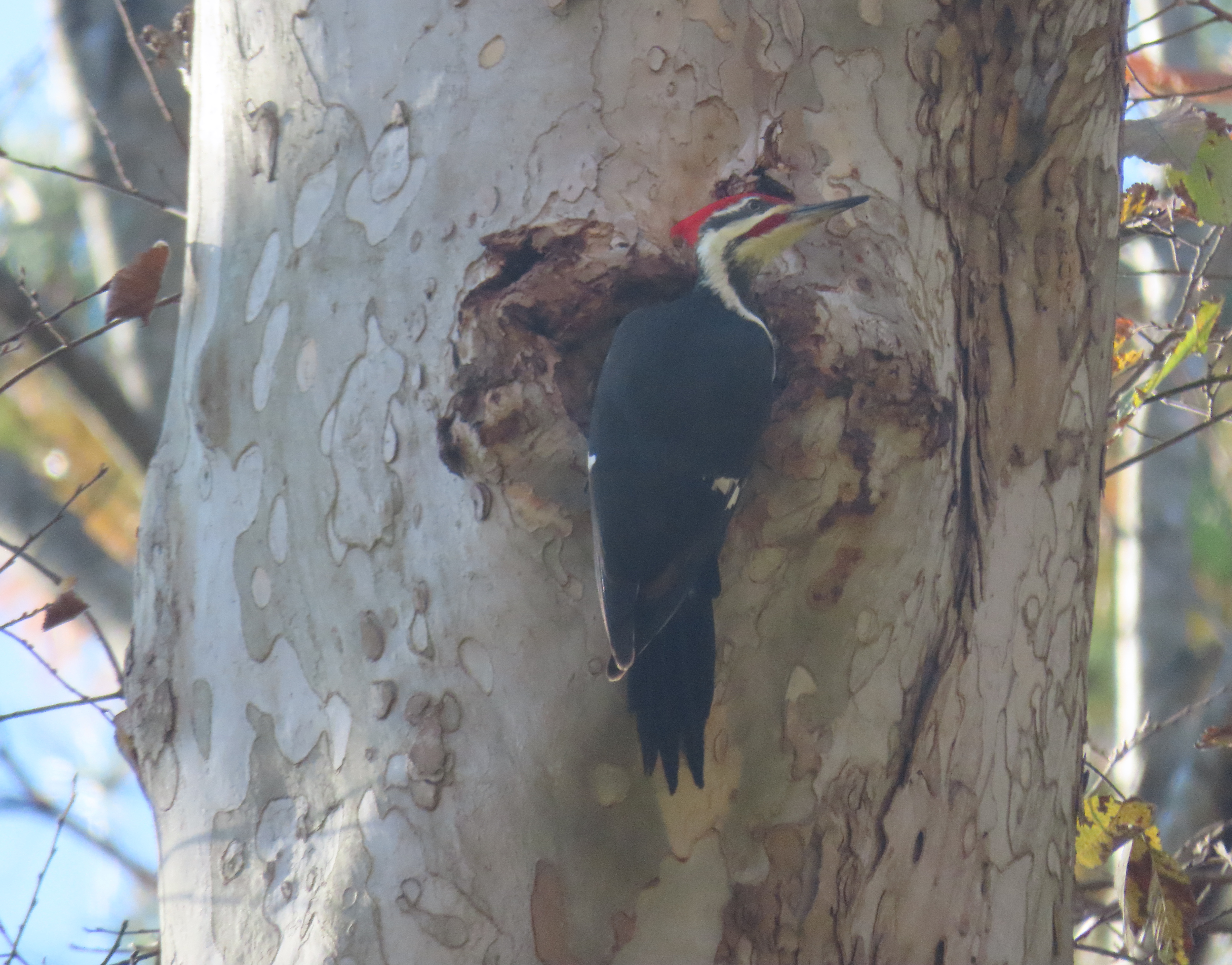 I saw a male Pileated Woodpecker working industriously (he gave that impression, anyway) in a big sycamore at Pony Pasture this morning. I couldn’t talk the light into shining just the way I wanted, but he’s a good looking guy on a good looking tree. You can tell he’s a male by the red patch just behind his bill, directly below his eye. Females have an unbroken black line there: