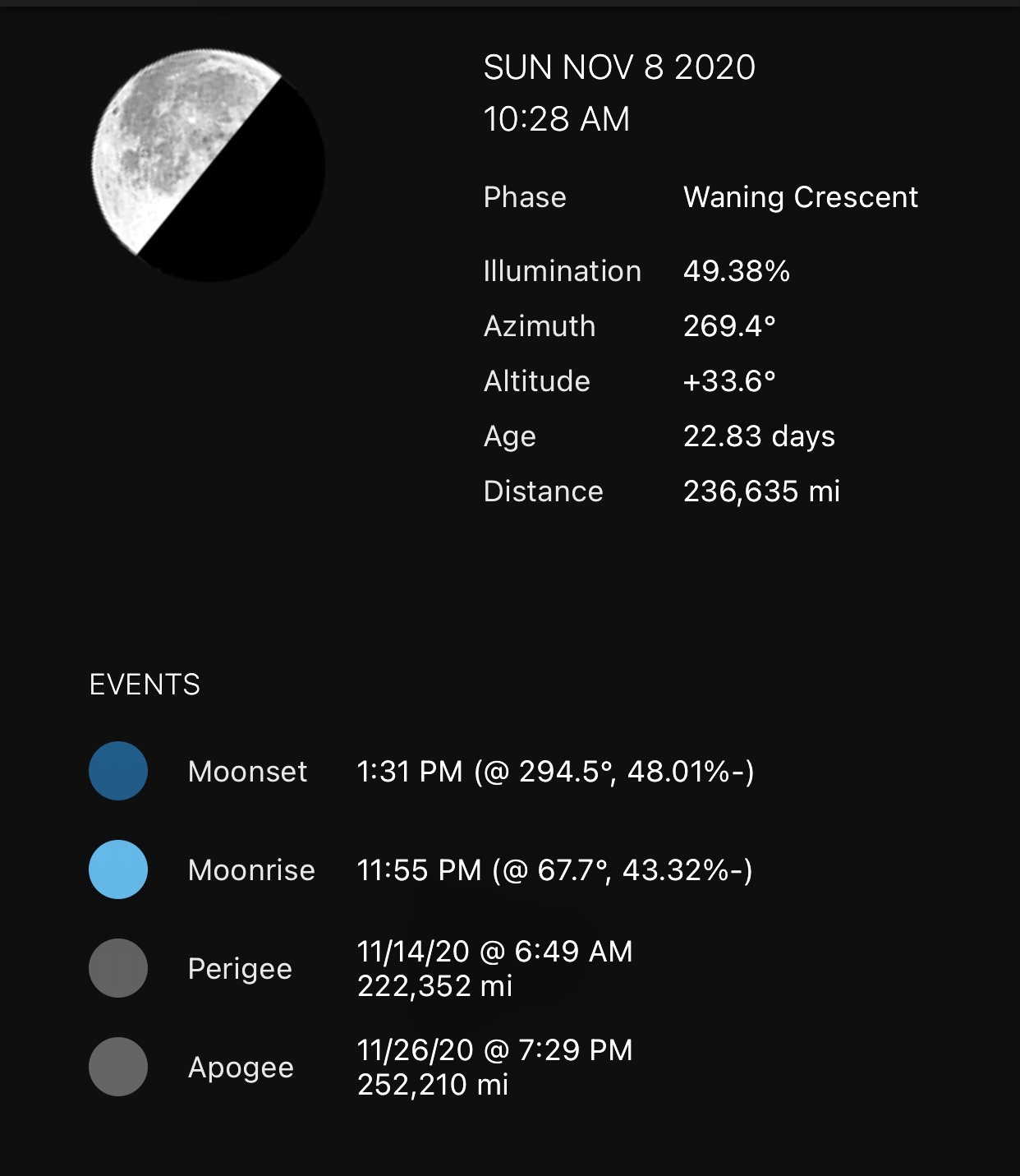 The moon was still clear in the sky when we were on our way back from the river. This is a “waning crescent” moon – it’s getting smaller. Always if it’s light on the left like this, it’s a waning moon. It looked pretty in the sky: