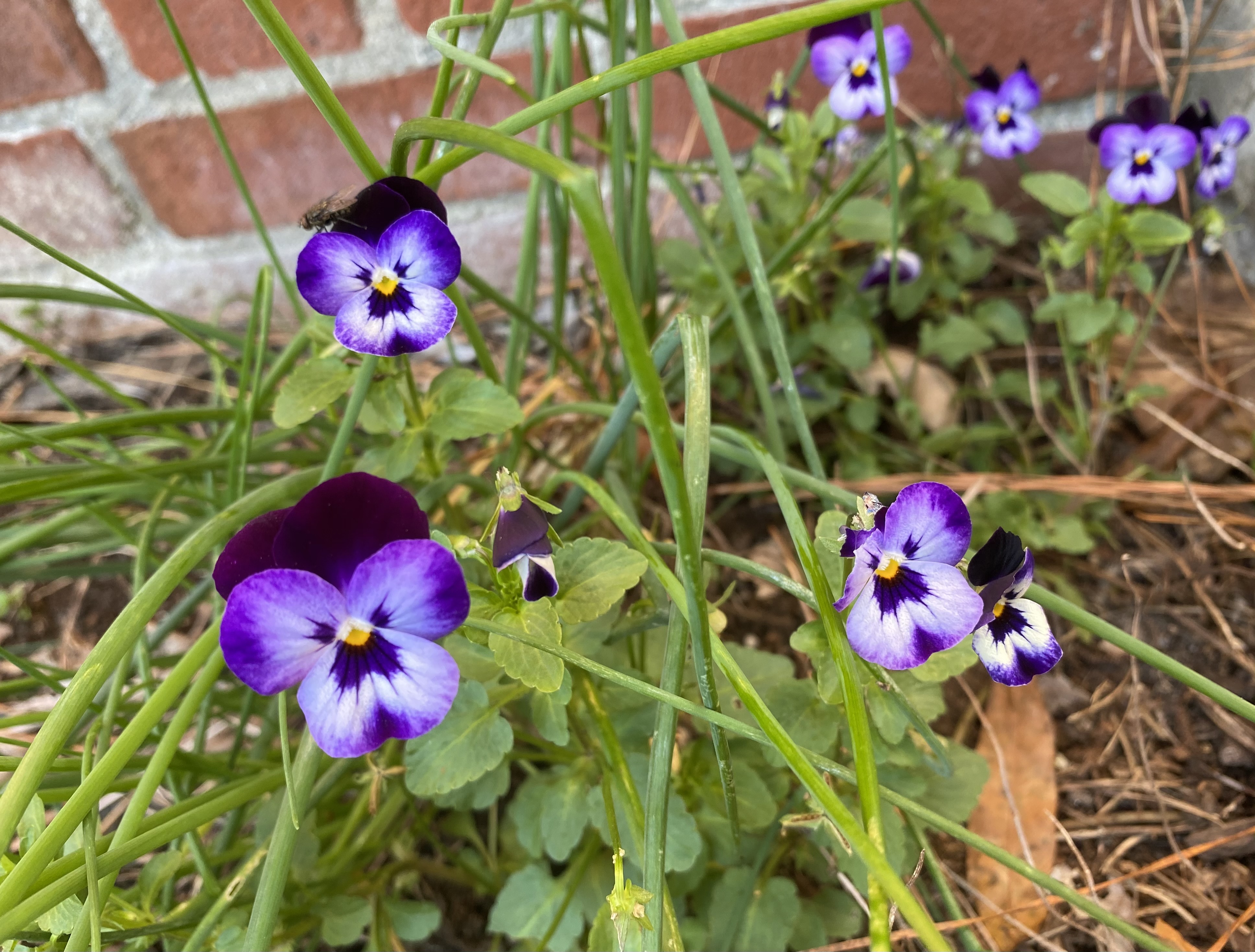 Just on the other side of the stoop – I can almost take these two pictures without moving – she’s growing “violas.” Members of the violet family I’m pretty sure. But very bright! Violas: