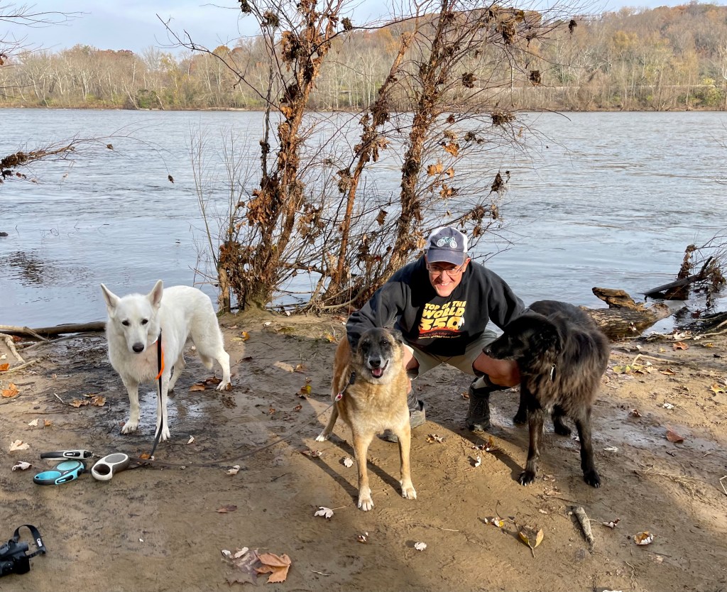 Mackey and Turner and Yuki and I had a pleasant hike this morning – especially since we saw the owl twice! I was hoping to see Buffleheads but I haven’t gotten a good image yet. We were headed back up the riverbank around 10:00 when we came across a group of middle-school aged boys racing up and down and over the logs and through the underbrush. One looked a little more confident and outgoing than the others. I stood with the dogs around me and held out my phone and said “Would you mind taking our picture?” And he replied confidently “You know I can!” as he reached out for the phone. These dogs are like magnets. I regret I did not ask his first name so I could credit him here. But thank you whoever you were!