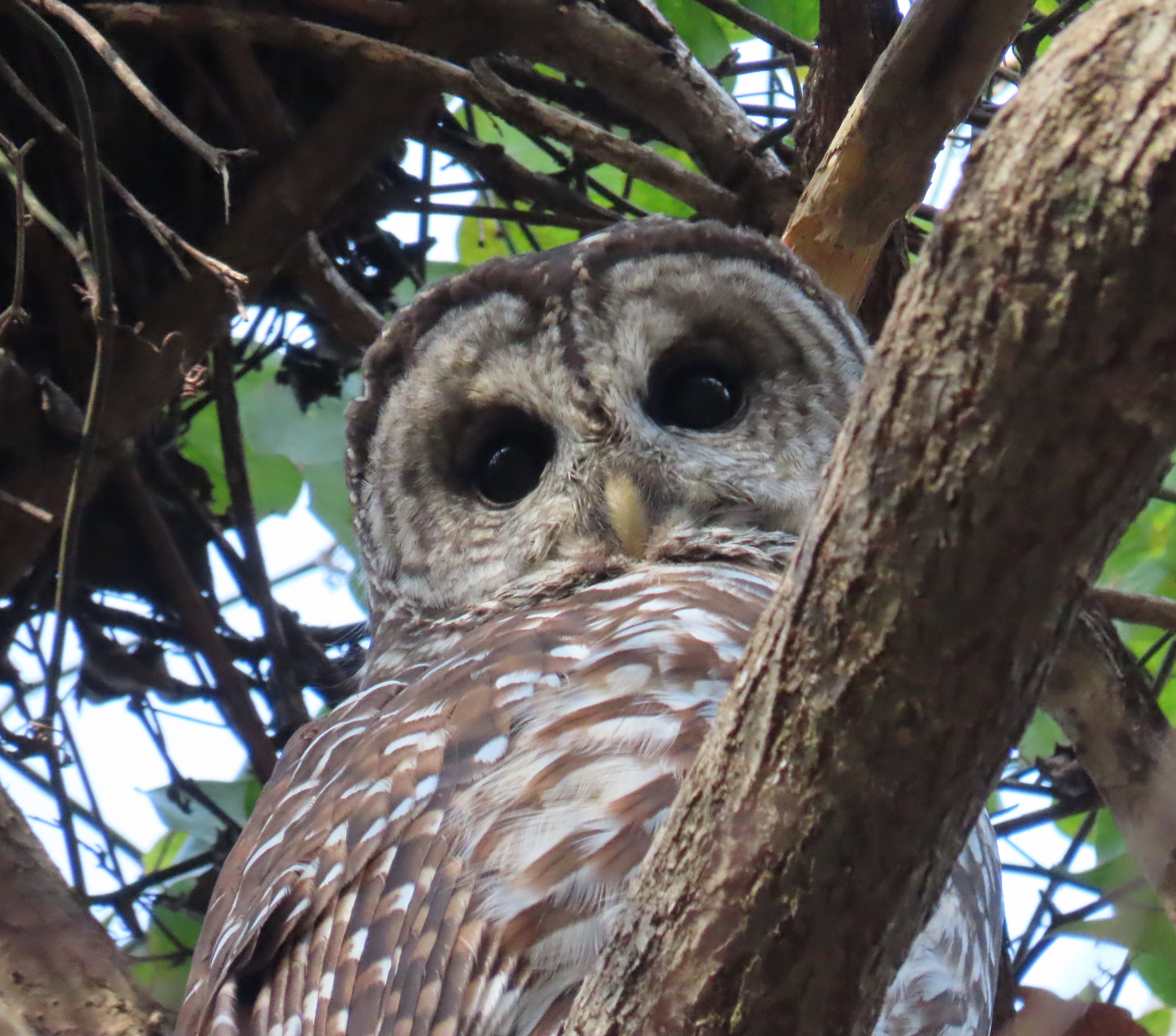 Barred owls are much too wild to take for granted. But I see them often in the same spot, and I am filled with the same rush of delight each time I look up and see one. I saw one at 9:15 this morning, then hiked for half an hour and came back – still there. 100% delightful 100% of the time: