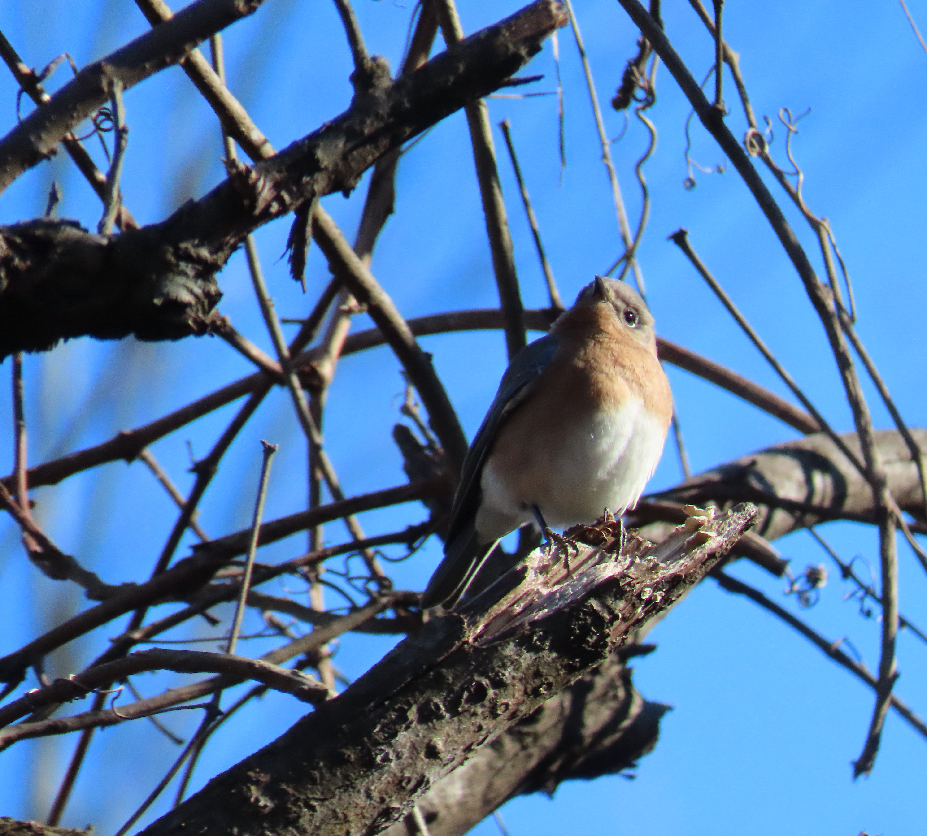 This bluebird was from Tuesday. I never tire of bluebirds either, but my experience of photographing songbirds (passerines) bears no resemblance to my experience of photographing owls and hawks and eagles and ospreys (raptors). Bluebirds are just trying to get something to eat, just like every other creature in those woods, but they don’t kill mammals or other birds. It’s an illusion, but they look peaceful: