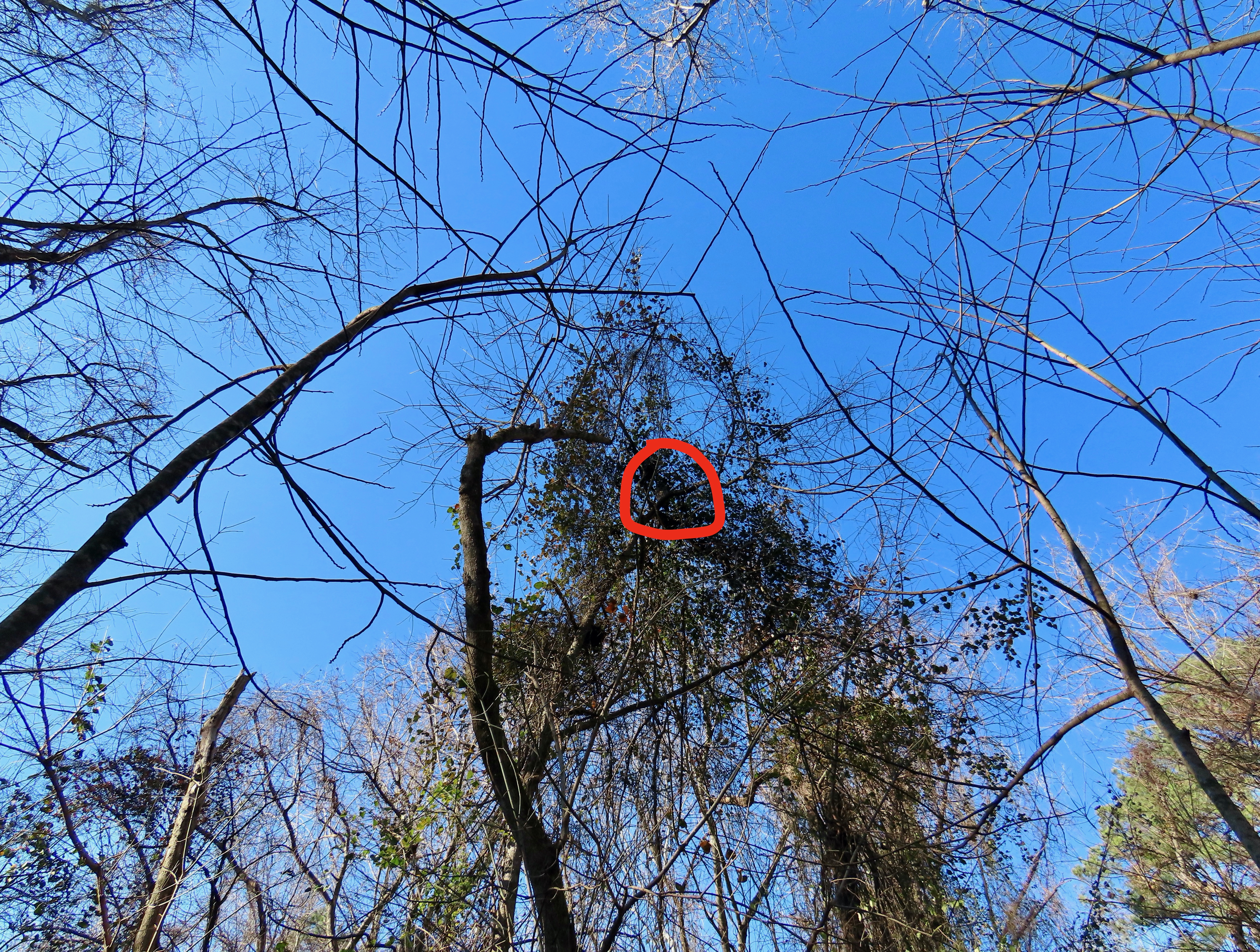 I just realized I took a picture a moment after that to demonstrate owl camouflage. Here’s the identical picture, taken practically the same minute, not using a zoom lens. You just don’t glance up and notice these birds – ever: