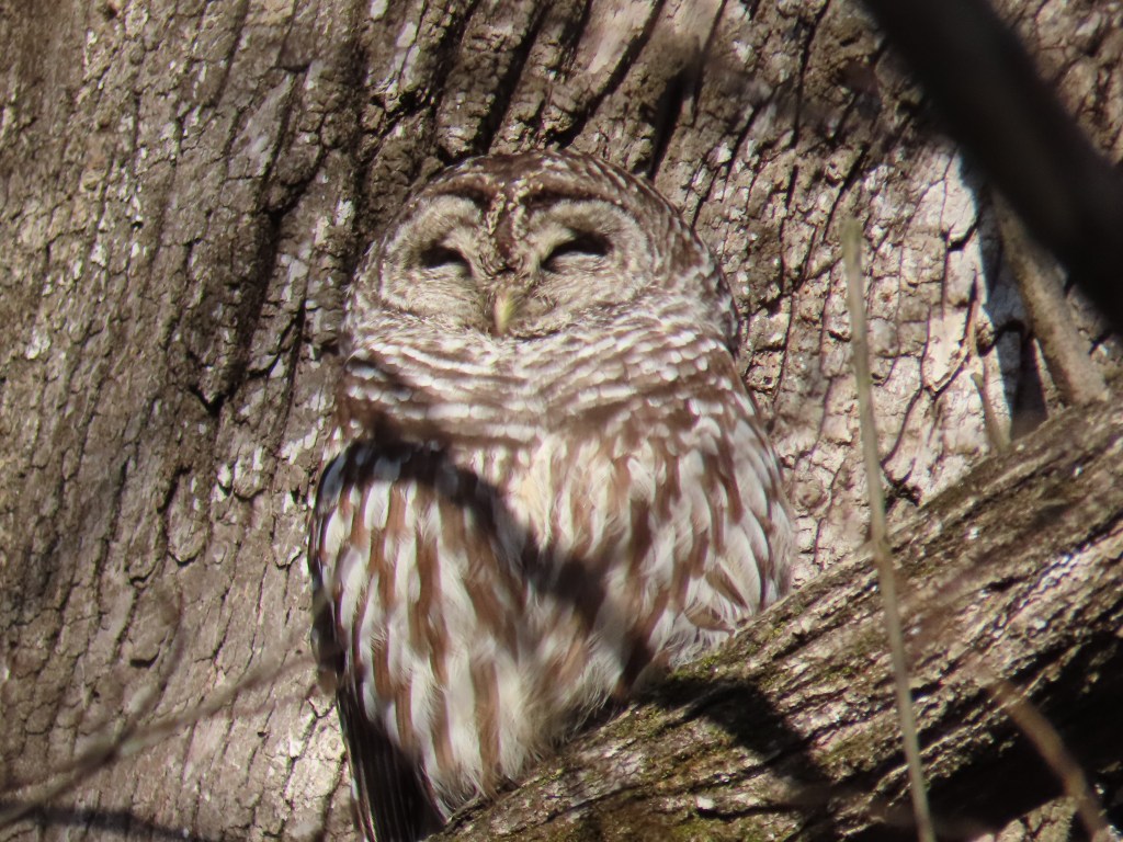 I wanted to make this the opening image because I loved it so much. The owls I normally see were not in the spot where I normally see them. We had a nice hike then headed back up the creek. I saw a “football in a tree” at the edge of the creek – and it was an owl! But its back was to us, and it was in shadow. We hiked back down the creek and up the other side until I just knew we were directly across from the owl. But it was invisible. I finally found it. Then I’d look away to see a cardinal or something and look back – it would disappear again. You can see why: