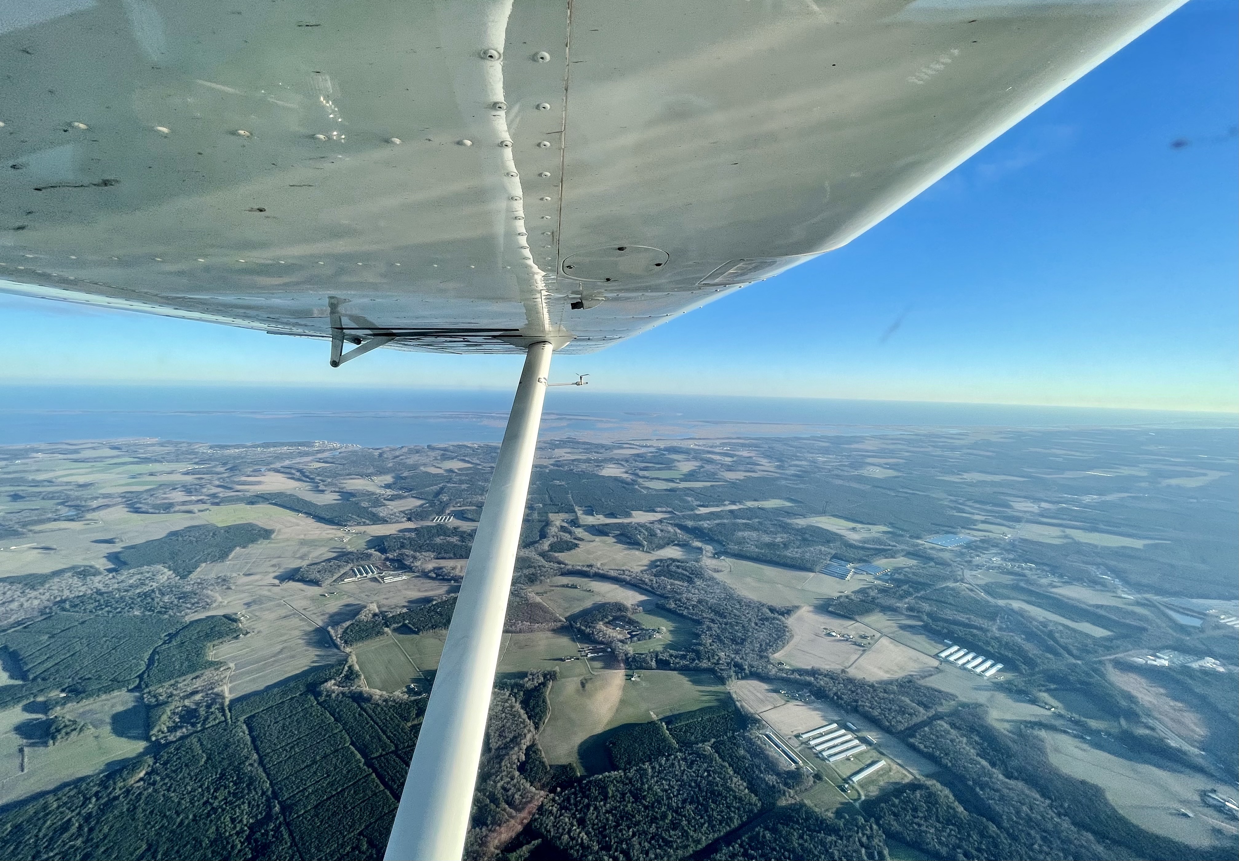 We flew home west (toward the setting sun) and it’s difficult to take what I regard as a good picture. Looking forward, anyway. But I was on the pilot’s side (left side, just like in a car) and I asked Joel if he’d take the controls for a couple of minutes so I could snap a picture. We were at 4,500 feet going around a hundred knots when I took this picture a bit before 4:00 PM yesterday: