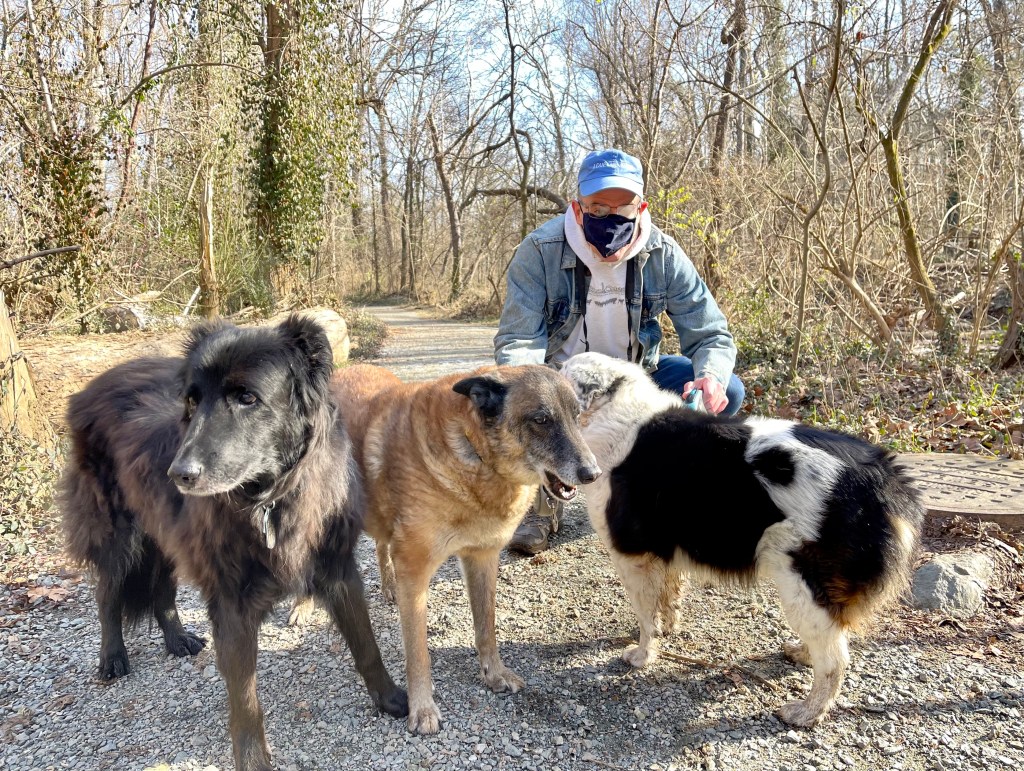 Dash and Ev stayed at the house this morning. Mackey and Turner and I picked up our old friend Luna and took her to the river. A very kind person named Mike took our picture. Thank you Mike!