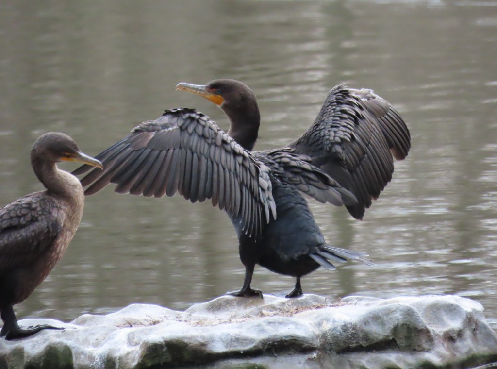 Another old friend and I went to Three Lakes Park near the intersection of 95 and 295 Thursday. I hadn’t been in decades – I was happy to visit again. Pony Pasture has lots of cormorants, but they’re always out on rocks. This one was on a fake rock (I’m pretty sure that’s a fake rock) but it spread its wings and looked nice in the sun: