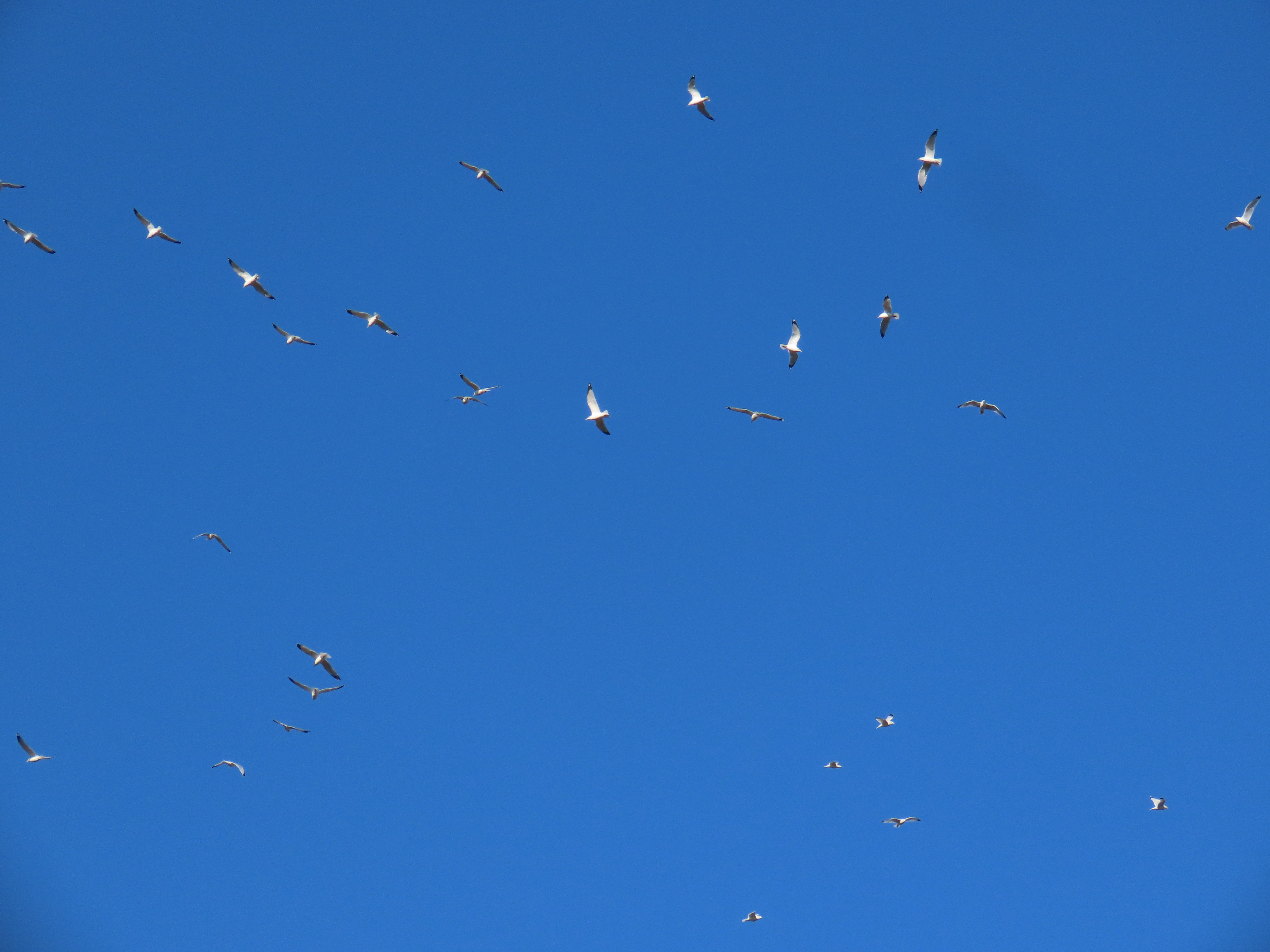 When Marion and I were at Pony Pasture Tuesday, the sky was blue and infinite, but a wheeling, screeching, high flying flock of gulls wheeled over the parking lot to lend perspective. This looks almost wall-paperish, but the blue is peaceful and the flecks of gulls are graceful: