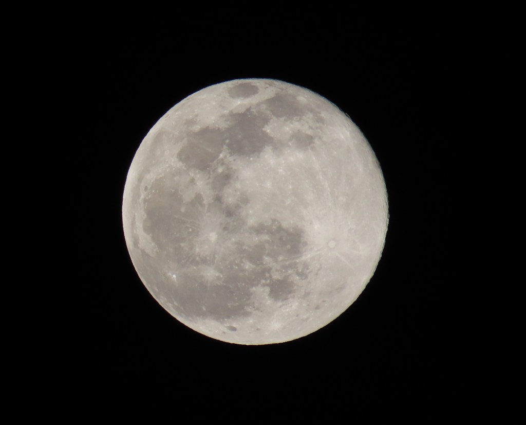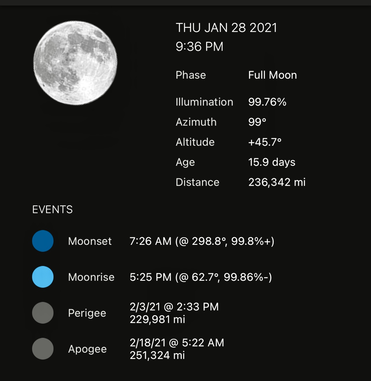 The following day (Thursday, January 28) the moon was just past full at 9:36 PM when Mackey and Turner and I got home from our walk. If you look closely on the right edge of the moon in this image you can see crater shadows. Fascinating: