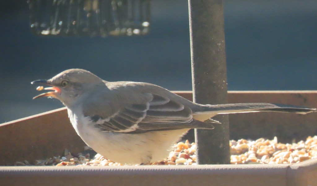 I’m going to wrap up the photography and jot down a few notes. But come back next week! I’ve never seen a picture of a mockingbird looking like this. I rarely see mockingbirds on my feeders at all: