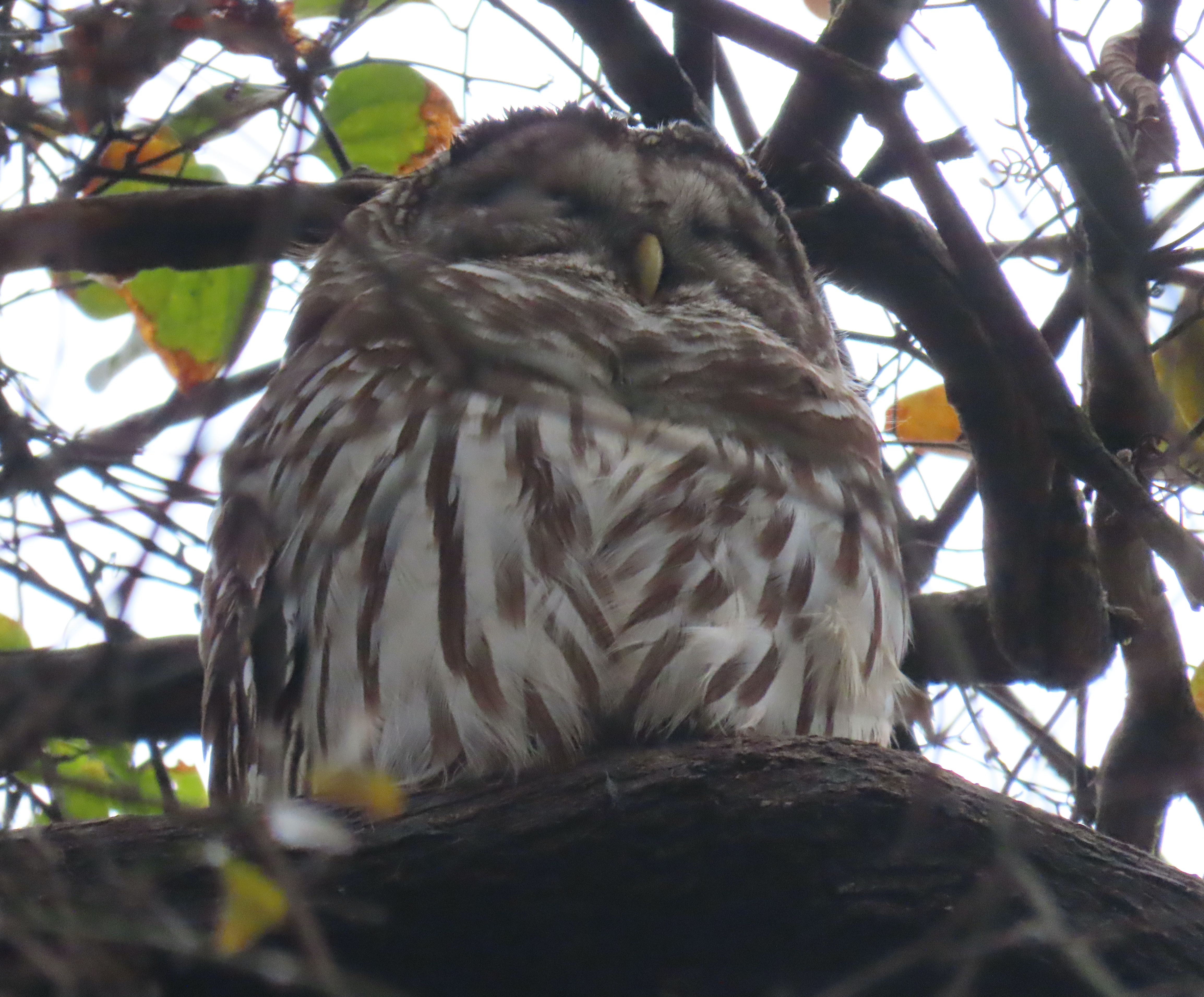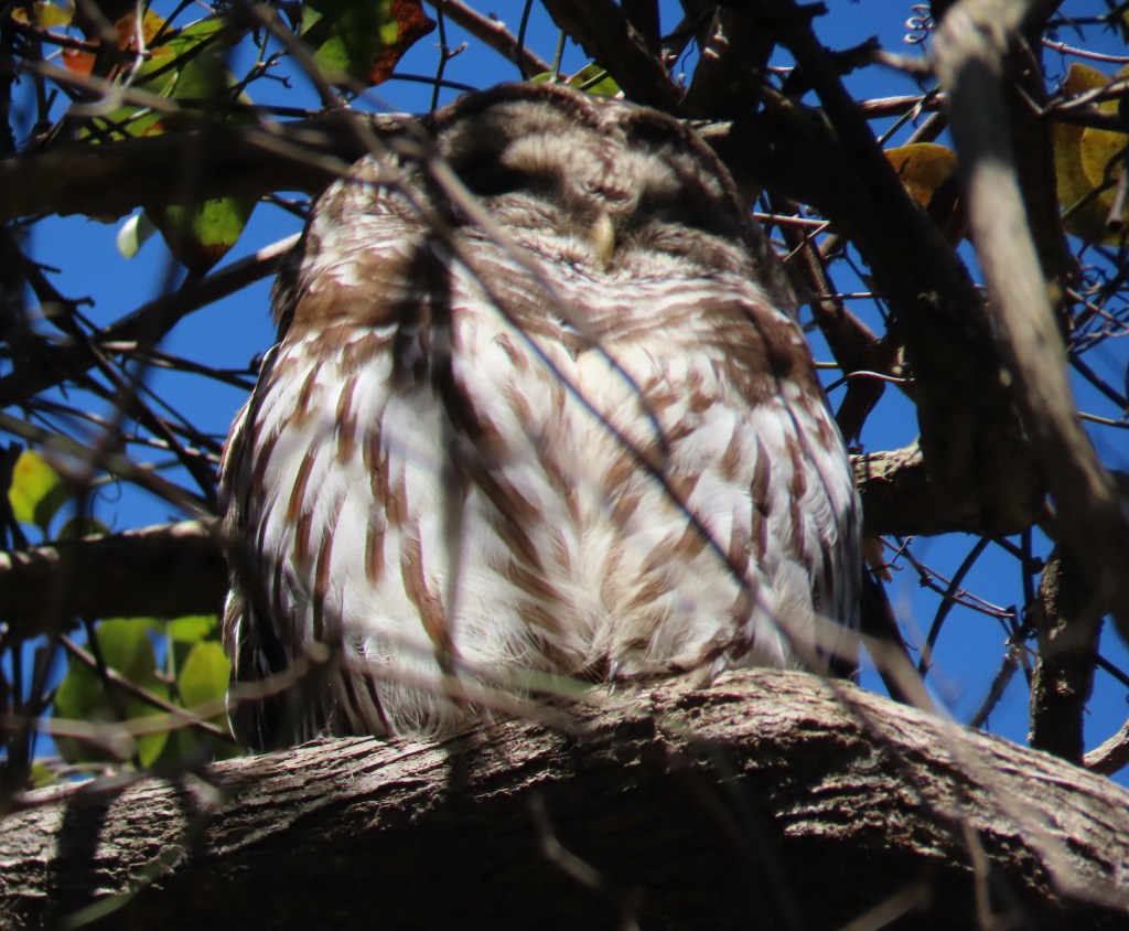 I was trying to decide if I would use Monday’s picture or today’s picture so I compared to see which one worked better. The sun was out today and Monday was gloomy and overcast, so I chose today’s picture. As I looked more closely at Monday’s picture, I realized the camera angle and the place where the owl was perched were nearly identical on the two days. Here is Monday’s picture. The sky is the color of watered down milk, but the pattern of the branches behind the owl is nearly identical: