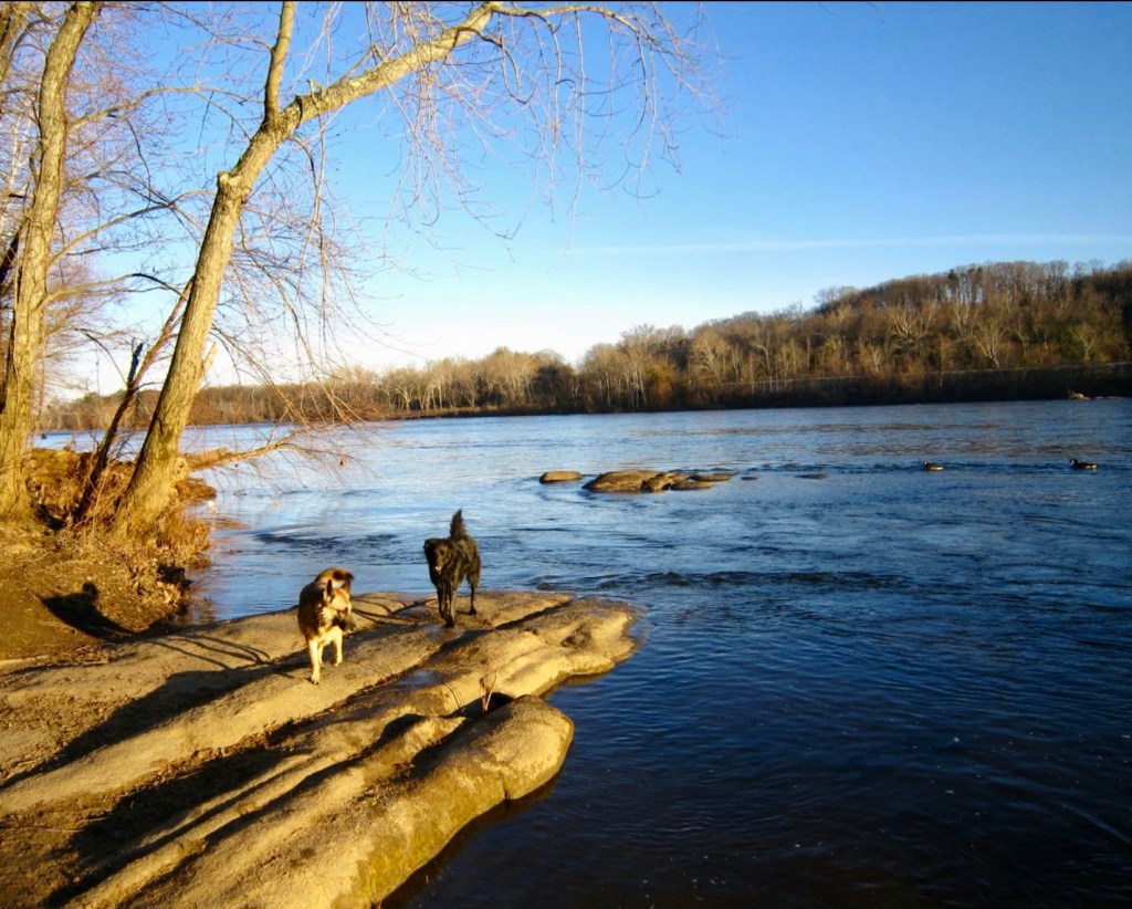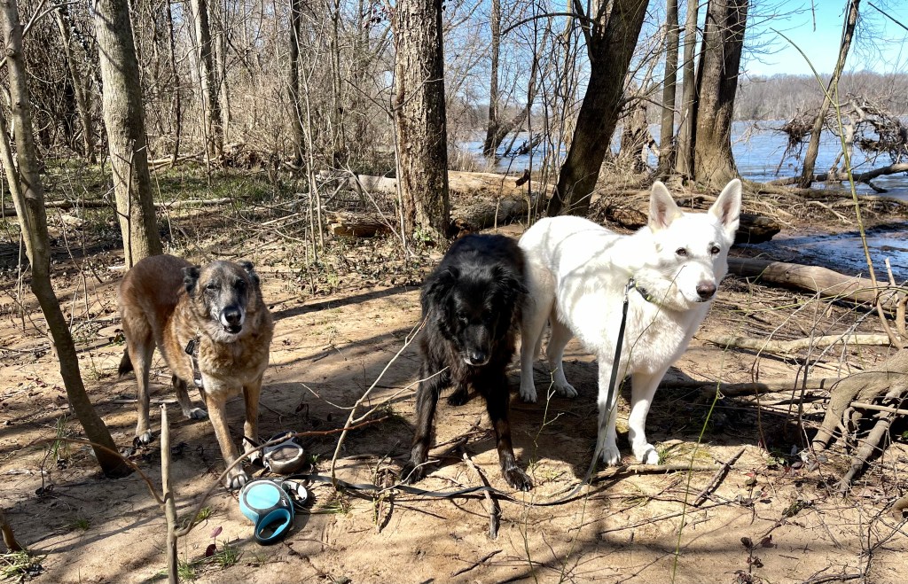 The river was low when I took that picture – probably below four feet. This morning it was around nine feet, or I would have recreated that picture. I’ll do it in another week or two when the water goes down some. Here’s the picture I took of Turner, Mackey, and Yuki at the river’s edge just before noon today: