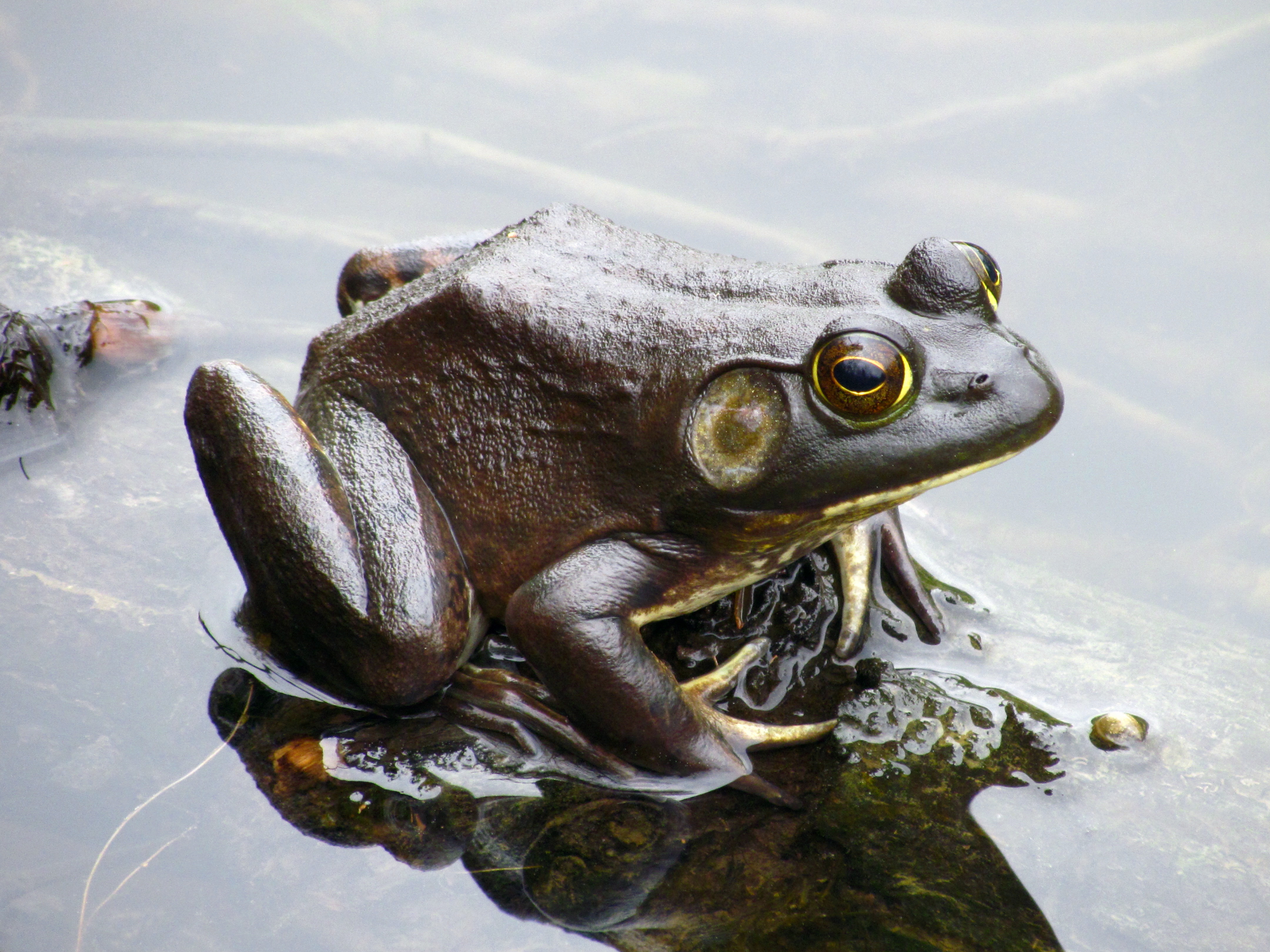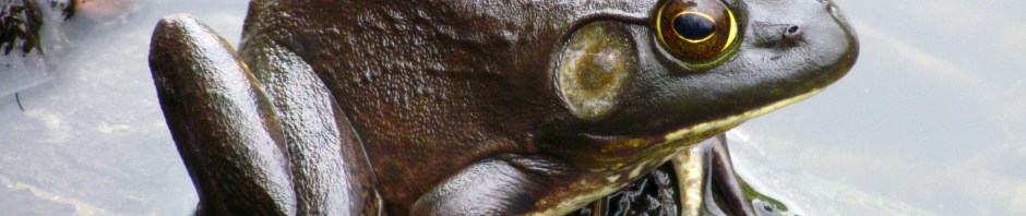 This may be the most technically proficient picture I’ve ever taken. It’s an American bullfrog (Lithobates catesbeianus). I took it at Bryan Park in Richmond, VA in April of 2013. You can see the original blog post at Froggie: