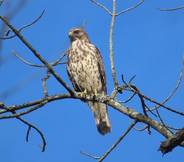 Anyway, back to “bookended with buteos.” I began the week with a Red-tailed hawk (Buteo jamaicensis) on the side of Three Chopt Road. When Mackey and Turner and Yuki and I pulled in the parking lot at Pony Pasture this morning, we had the windows wide open and we could hear crows mobbing before we even got to our parking space. In my experience, that could only have been an owl or a hawk. You cannot believe how loud they were. It could have been fifteen crows, maybe twenty. I could see the crows darting in and out of the trees – most of the leaves are still on – but I couldn’t see what was making them so irate. Finally I looked up and saw an adult Red-shouldered hawk (Buteo lineatus) on a branch with an immature Red-shoulder perched two feet away. You can’t see the youngster’s face here, but this is the two of them together: