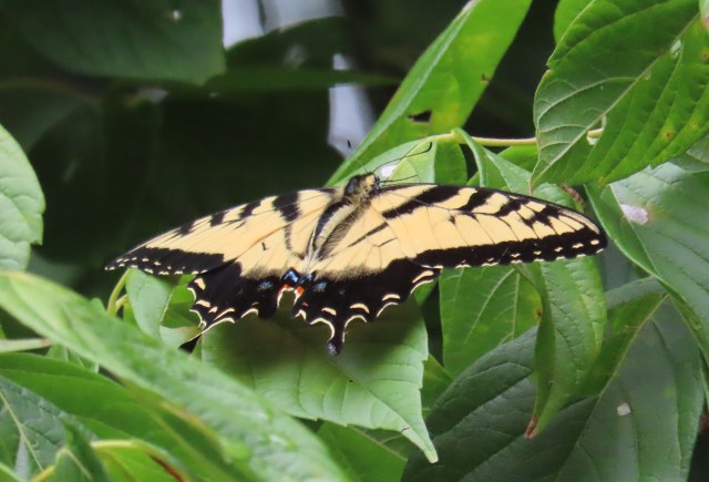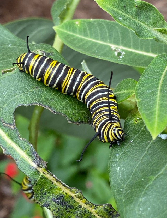 The butterfly turnout has been slender so far this year, at least outside my window. But Evelyn pointed out early this afternoon – we got our first 2020 Monarch caterpillar on the milkweed she planted! Check this beauty out:
