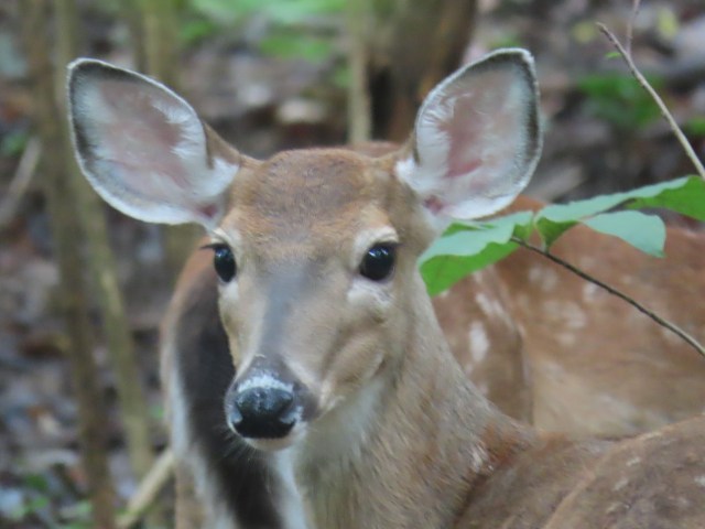 Anyway, back to “bookended with buteos.” I began the week with a Red-tailed hawk (Buteo jamaicensis) on the side of Three Chopt Road. When Mackey and Turner and Yuki and I pulled in the parking lot at Pony Pasture this morning, we had the windows wide open and we could hear crows mobbing before we even got to our parking space. In my experience, that could only have been an owl or a hawk. You cannot believe how loud they were. It could have been fifteen crows, maybe twenty. I could see the crows darting in and out of the trees – most of the leaves are still on – but I couldn’t see what was making them so irate. Finally I looked up and saw an adult Red-shouldered hawk (Buteo lineatus) on a branch with an immature Red-shoulder perched two feet away. You can’t see the youngster’s face here, but this is the two of them together: