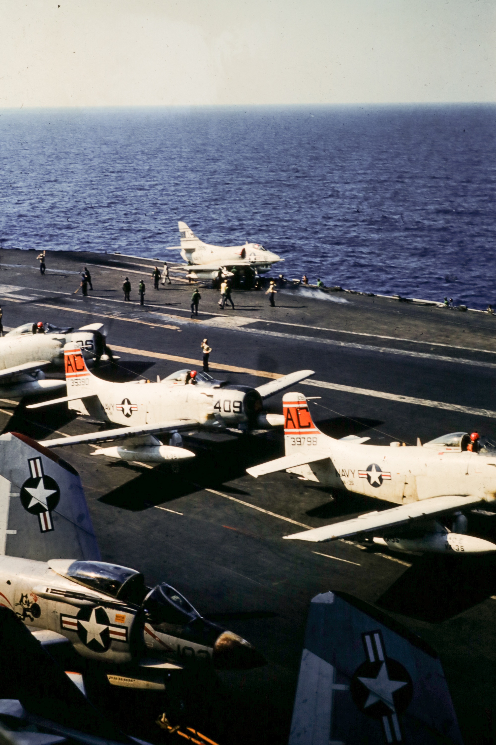 Foreground: F3H Demon Middle: Line of Douglas A-1 Skyraiders Rear: A4 sitting on catapult