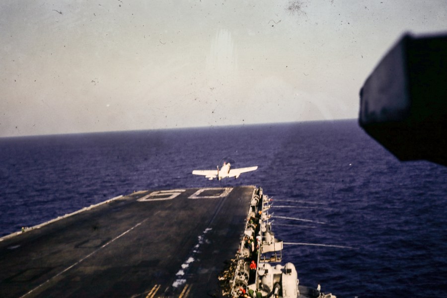 Douglas A-1 Skyraider (AD-1) catapult shot off the bow of the Saratoga: